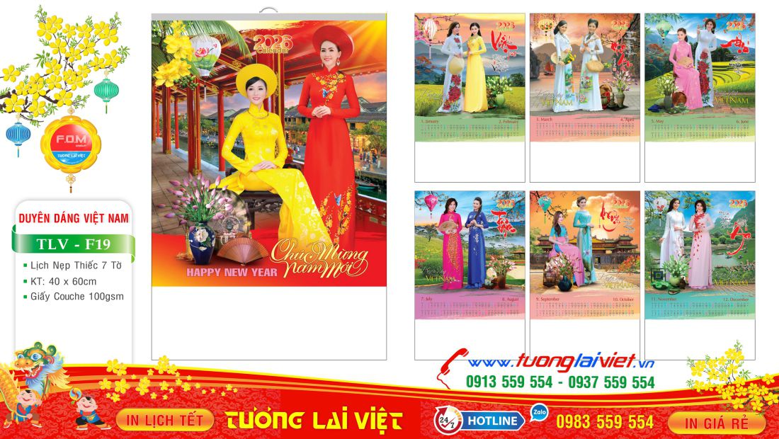 Lịch 7 tờ nẹp thiếc thường được in Offset 1 mặt trên giấy C105gsm, có kích thước: 36×70 và 45x70cm. Lịch 7 tờ Áo dài là mẫu lịch tờ treo tường giá rẻ nên được nhiều cửa hàng nhỏ lẻ chọn in lịch tết năm nay để làm quà tặng cuối năm cho khách hàng, bạn bè, đối tác và người thân nhân dịp năm mới.